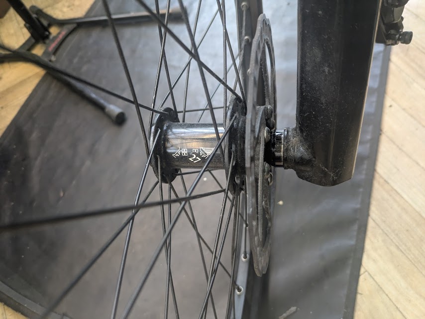 レフティのフロントホイールは、右側からボルト1本で止まっているだけですが、何も考えずに緩めると、ホイールが右側に移動してくるので、ディスクローターがブレーキキャリパーに当たって歪んでしまいます。