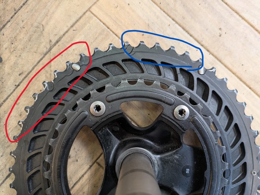 このクランクセットは50-34Tですが、アウターである50Tをずっと使っていると、チェーンのインナーリンクとアウターリンクの当たる歯がずっと同じままなので、インナーリンクの当たっている歯だけ摩耗が進みがちになります。